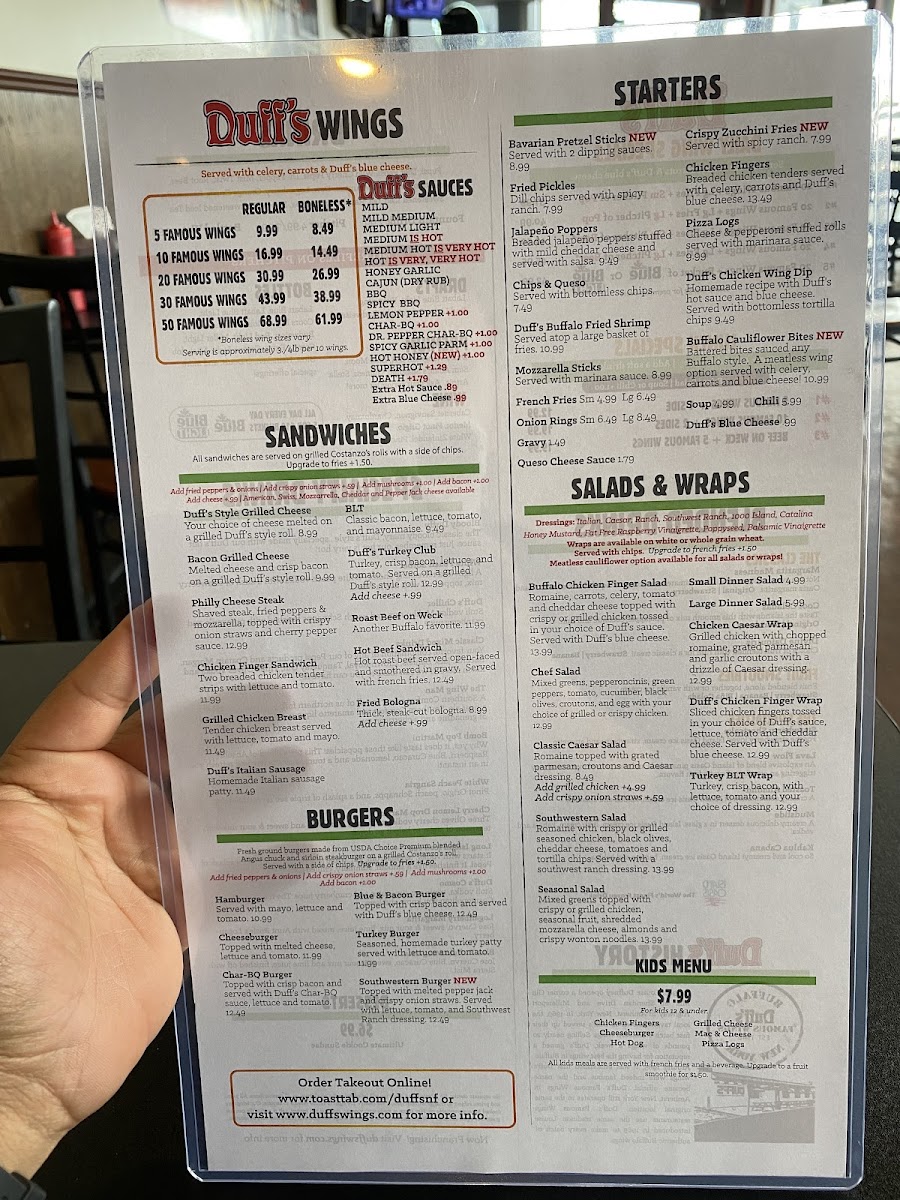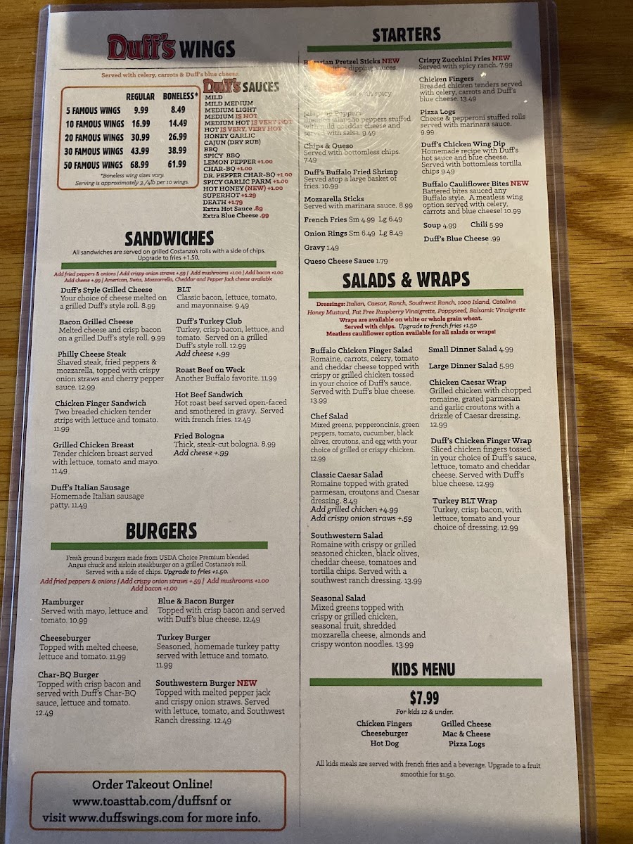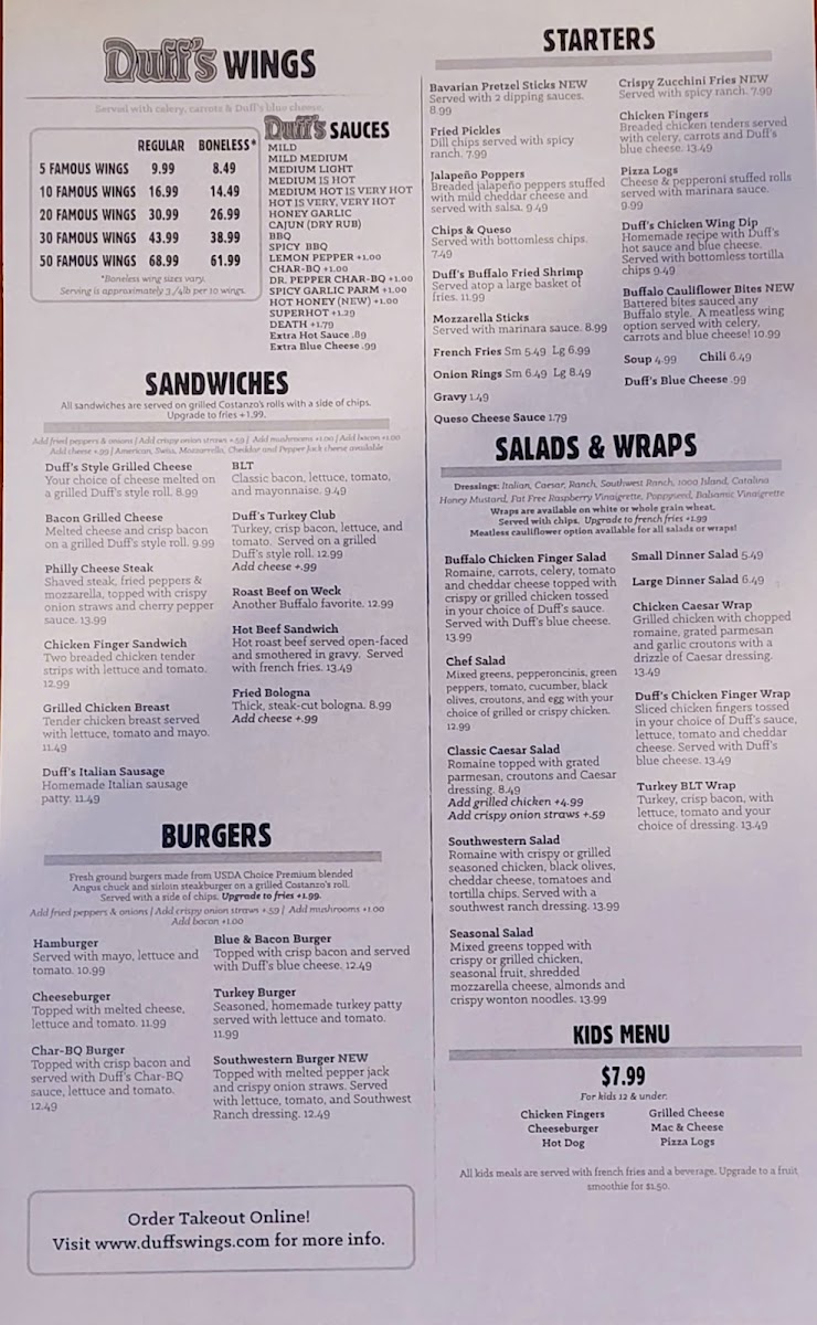 Welcome to Duff's Famous Wings - Niagara Falls, where the essence of Buffalo-style wings meets exceptional flavor! Located at 8351 Niagara Falls Blvd, this culinary gem is renowned for its mouthwatering menu. Start your meal with crispy onion rings or the tasty Buffalo fried shrimp, which are fried to golden perfection. For those looking for a lighter option, the seasonal chicken salad offers a delicious blend of greens, chicken, and seasonal fruit.